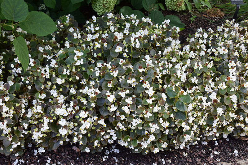 Cocktail® Whiskey® Begonia features dainty white orchid-like flowers at the ends of the stems from mid spring to mid fall. Its attractive succulent heart-shaped leaves remain dark green in color with hints of coppery-bronze throughout the year.