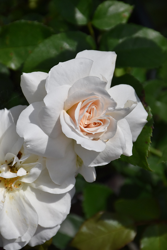 Champagne Wishes Rose features showy double white flowers with peach overtones and gold eyes at the ends of the branches from early summer to late fall. The flowers are excellent for cutting. It has dark green deciduous foliage. The glossy oval compound leaves do not develop any appreciable fall color.
