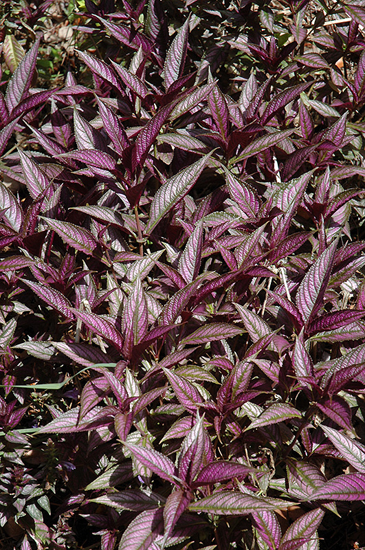 Persian Shield's attractive large glossy pointy leaves emerge deep purple in spring, turning purple in color with distinctive black veins and tinges of silver the rest of the year on a plant with an upright spreading habit of growth. It features dainty spikes of violet trumpet-shaped flowers rising above the foliage from late fall to late winter.