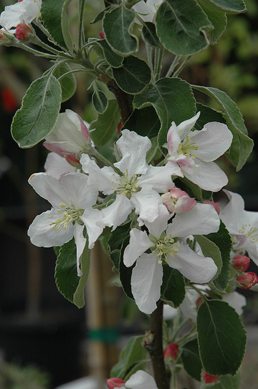 Granny Smith Apple features showy clusters of lightly-scented white flowers with shell pink overtones along the branches in mid spring, which emerge from distinctive pink flower buds. It has forest green deciduous foliage. The pointy leaves turn yellow in fall. The fruits are showy light green apples carried in abundance in early fall. The fruit can be messy if allowed to drop on the lawn or walkways, and may require occasional clean-up.