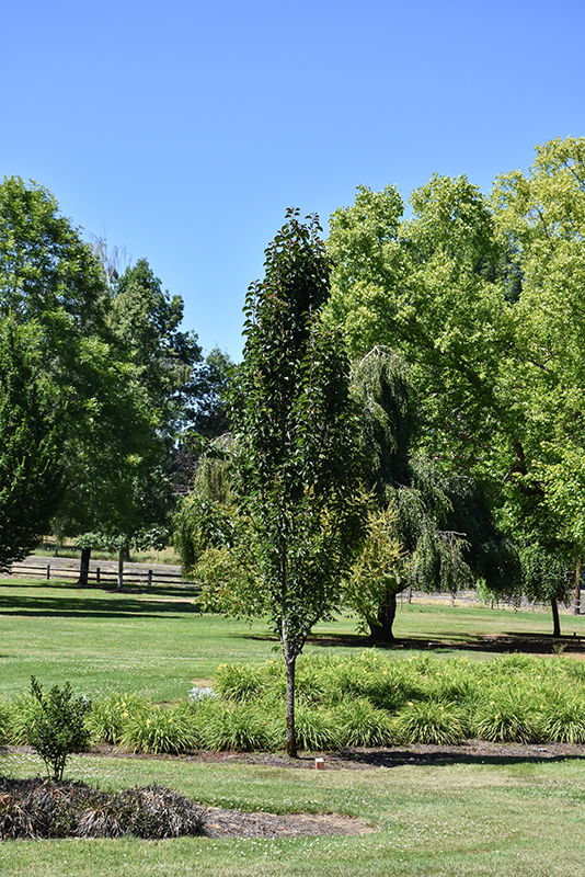 A tightly columnar accent tree that stays narrow as it matures; perfect for home landscapes or use as a narrow street tree; emerging burgundy foliage turns glossy dark green in summer, with excellent orange to red fall color; fireblight resistant