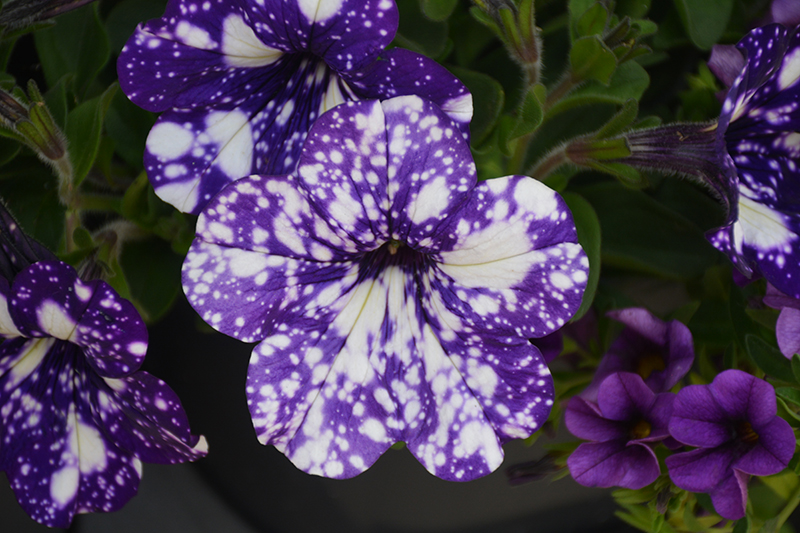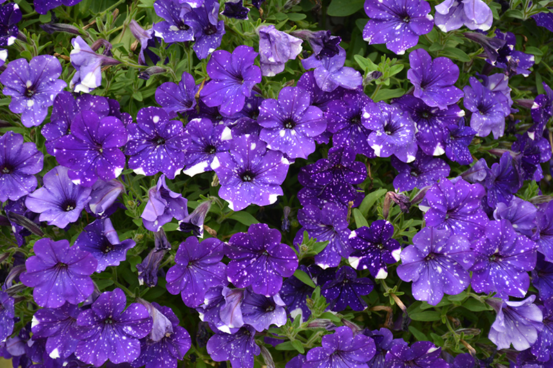Headliner™ Night Sky® Petunia is bathed in stunning purple trumpet-shaped flowers with sky blue overtones and white spots at the ends of the stems from mid spring to early fall. Its pointy leaves remain green in color throughout the season.