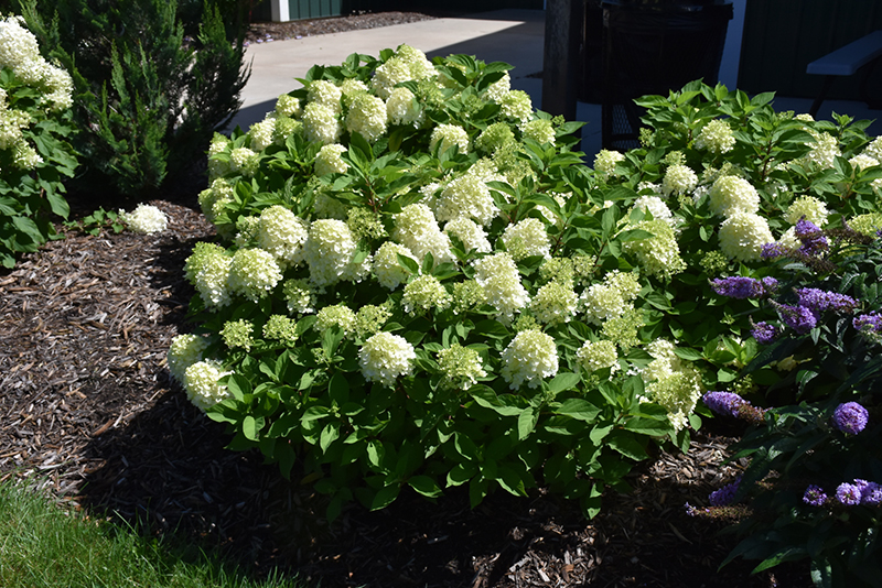 Fire Light Tidbit® Hydrangea features bold conical white flowers with pink overtones at the ends of the branches from mid summer to late fall. The flowers are excellent for cutting. It has green deciduous foliage. The pointy leaves do not develop any appreciable fall color.