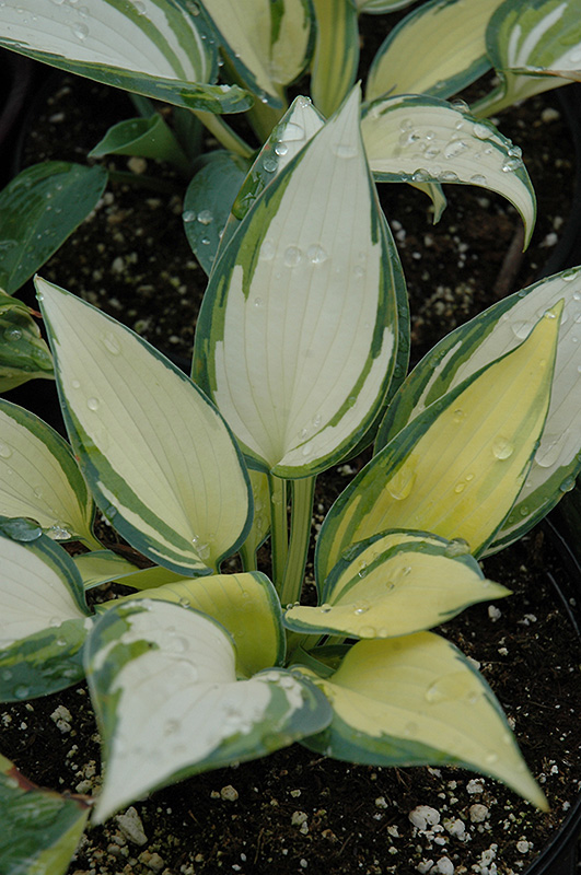 Remember Me Hosta features dainty spikes of lavender tubular flowers rising above the foliage in mid summer. Its attractive small textured pointy leaves remain creamy white in color with showy bluish-green variegation and tinges of green throughout the season.